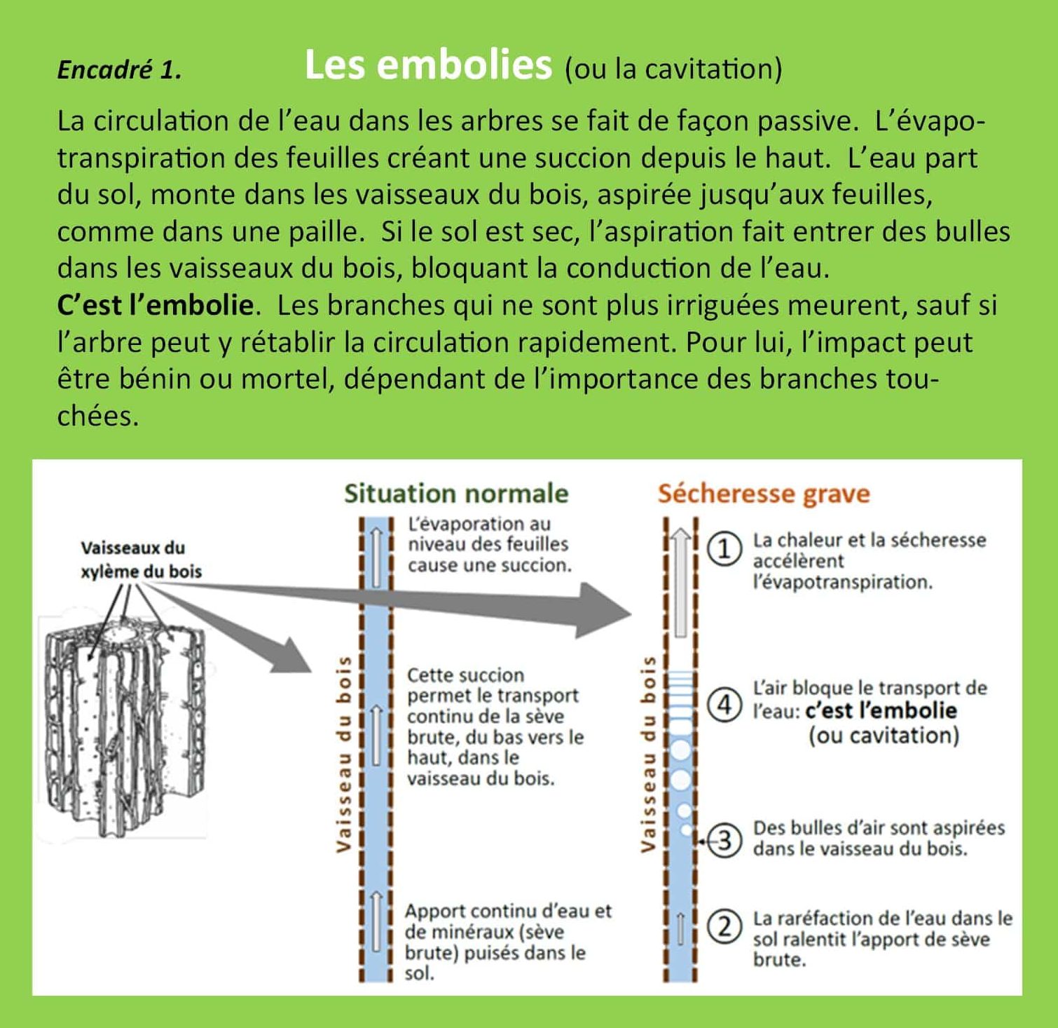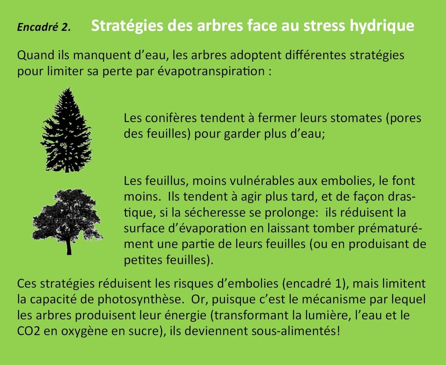 Le manque d’eau des sols forestiers n’affecte pas seulement les jeunes arbres. Les plus vieux risquent également les embolies (encadré 1). De plus, le stress hydrique induit une baisse de la photosynthèse des arbres (encadré 2) qui a notamment pour effet de réduire leur croissance. Un article récent du devoir titrait justement « Déclin généralisé de la croissance des arbres, au Canada », qui présentait les résultats d’une étude pancanadienne qui pointait le manque d’eau comme le principal facteur limitant la croissance.